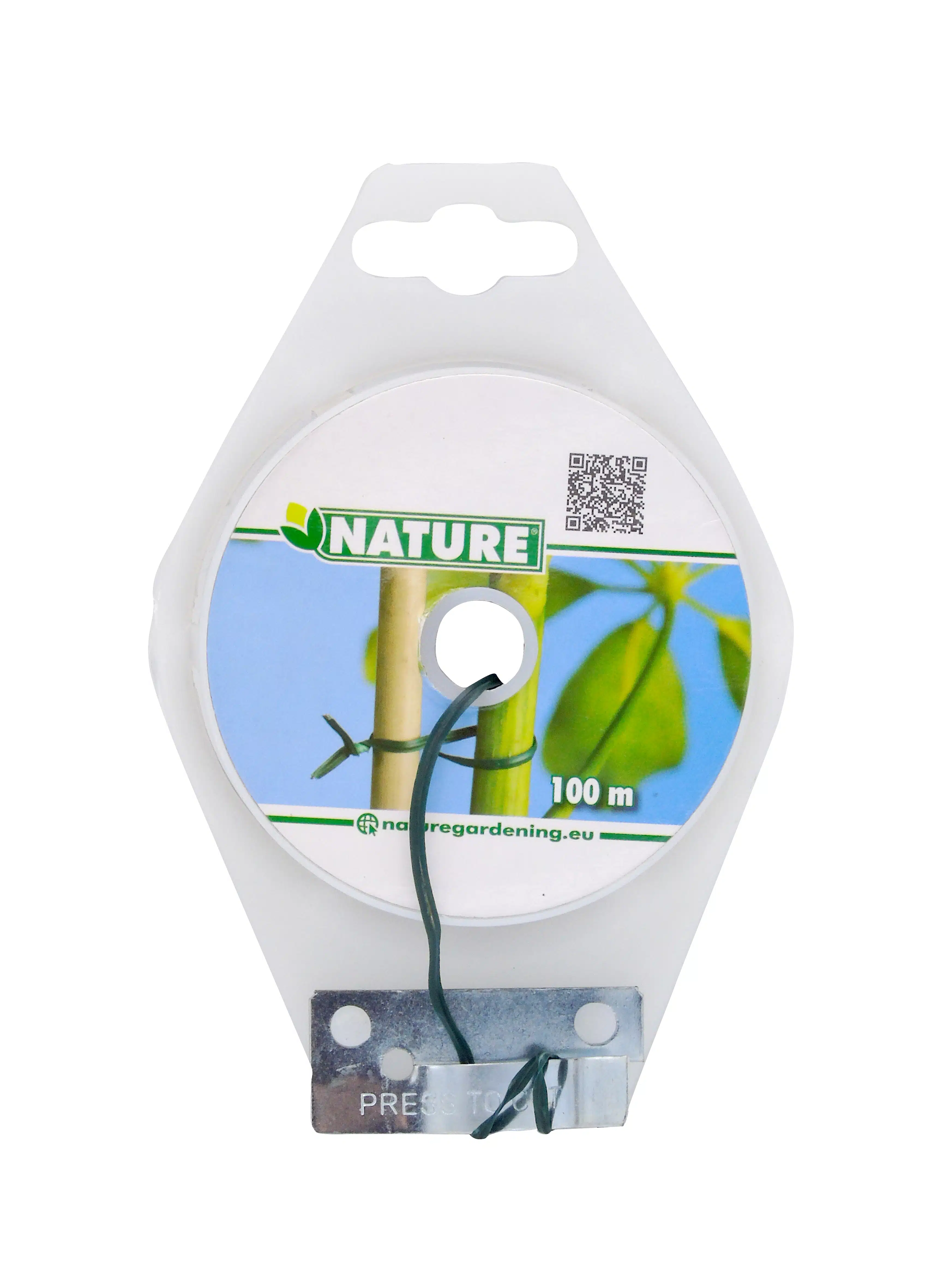 Geplastificeerd bindband van groene kunststof met metalen kern van Nature. Het bindband is multifunctioneel, roest niet en valt niet op dankzij de groene kleur. Lengte 100 m.