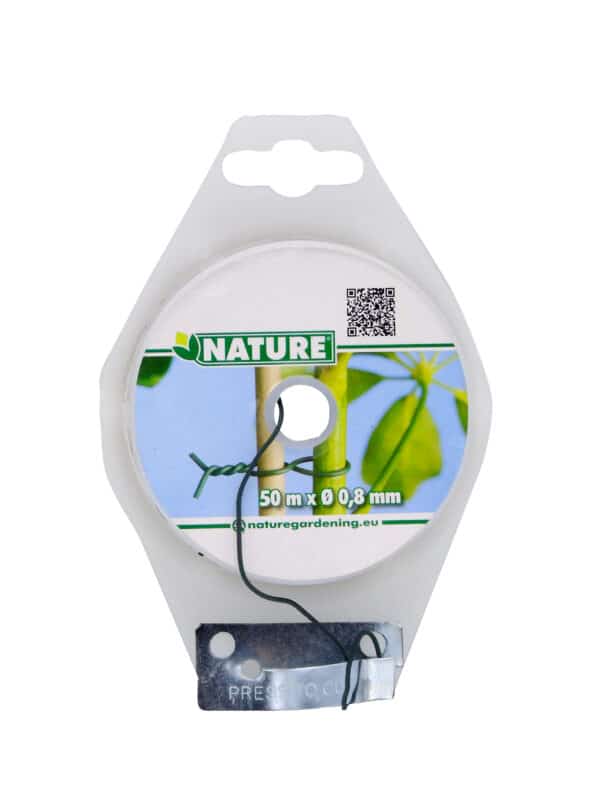 Binddraad van groen geplastificeerd metaaldraad van Nature. Dit multifunctionele binddraad roest niet en is verkrijgbaar in diverse maten. Dankzij de groene kleur valt hij niet op in de tuin. Afmeting Ø 0,8 mm x 50 m.