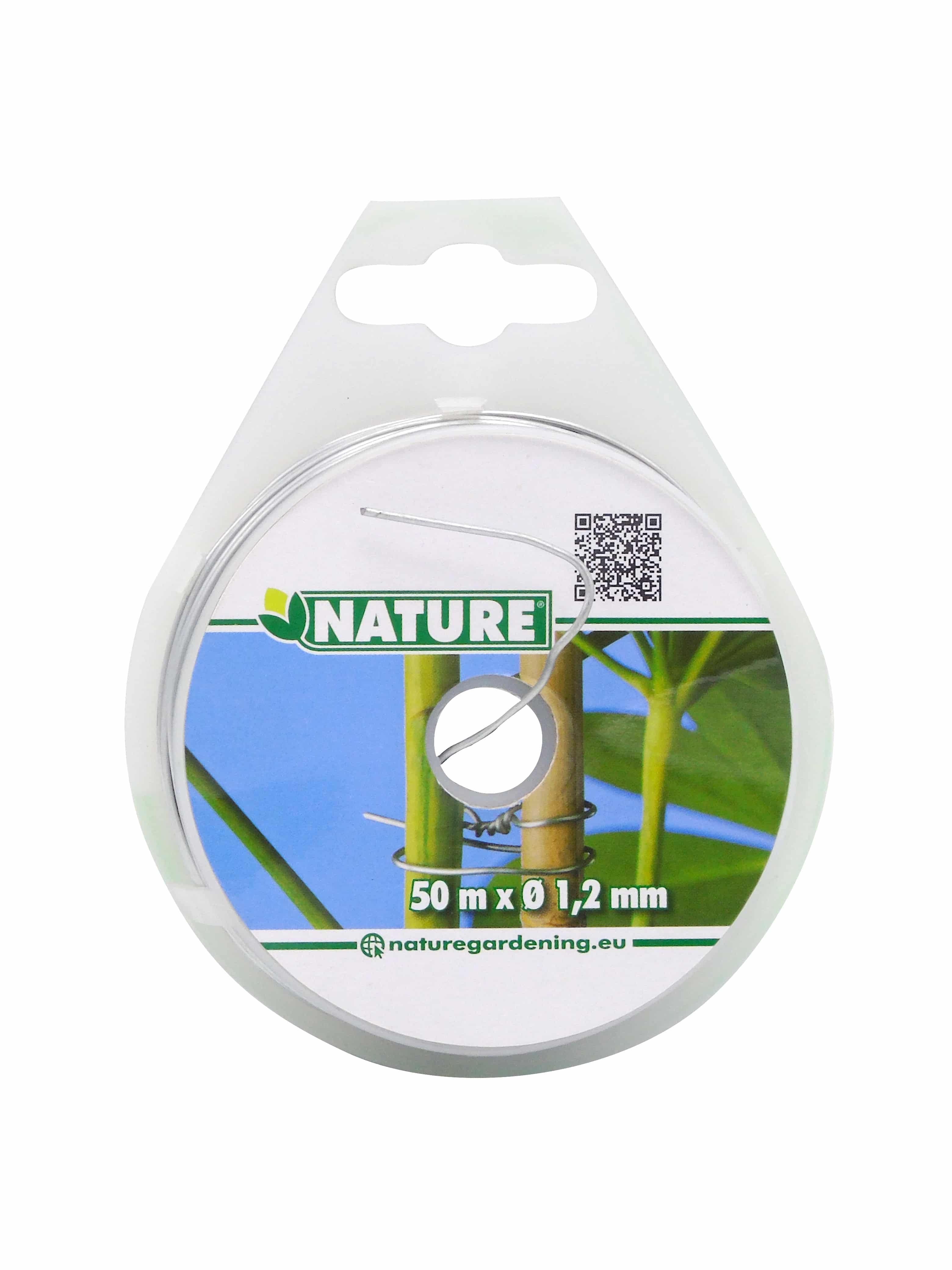 Multifunctioneel verzinkt binddraad van Nature. Eenvoudig in gebruik en roest niet. Afmeting Ø 1,2 mm x 50 m.