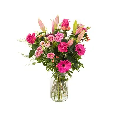 Boeket met roze kleuren o.a. gerbera’s, eustoma’s, lelie’s, bijpassende bloemen en seizoensgroen.