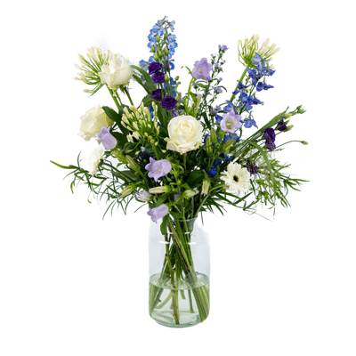 Boeket met witte en blauw/paarse kleuren met bijpassende bloemen en seizoensgroen.