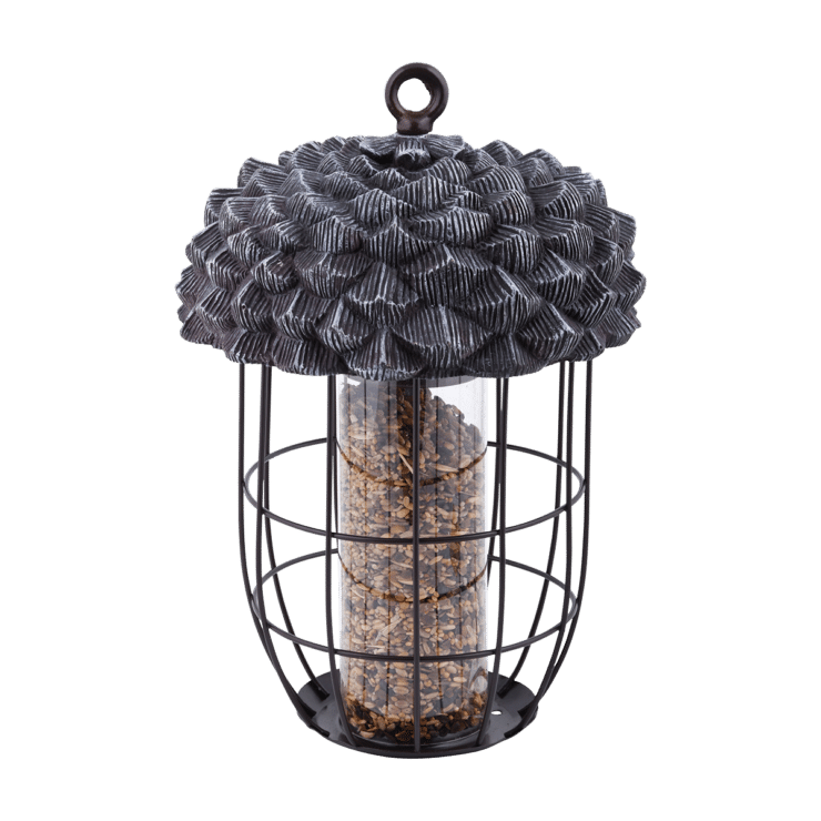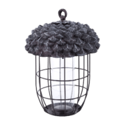 Deze voedersilo in de vorm van een eikel beschermt het voer tegen eekhoorns en weersinvloeden. Deze leuke silo doseert het voer en is gemakkelijk te (na) vullen door de ophangring los te draaien en het deksel op te tillen.