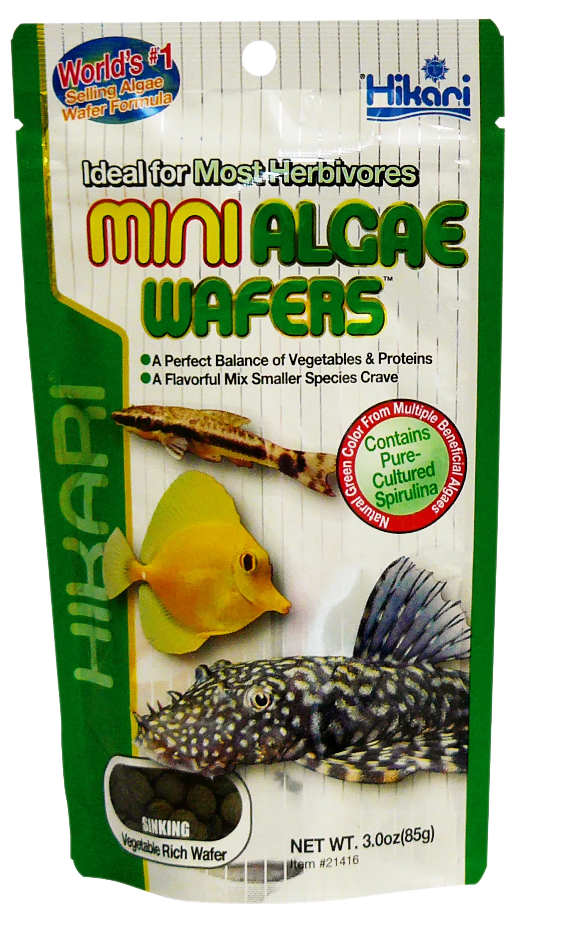 Hikari Mini Algae Wafers is het meest gekocht voer in miniatuurversie voor kleinere algeneters zoals Otocinclus en zeewater herbivoren. Hikari heeft dit succesvolle voer nu nog beter gemaakt. De nieuwe formule bevat nog meer plantaardige ingrediënten, waaronder meerdere algensoorten zoals spirulina en chorella. De Hikari Mini Algae Wafers lossen niet snel op, wat heel belangrijk is voor nachtelijke eters zoals Plecostomus, die geen vast eetpatroon kennen. De perfecte algae wafer voor kleine algeneters. Barstensvol plantaardige ingrediënten. Snel zinkend en behoudt lange tijd zijn vorm.