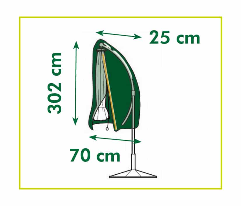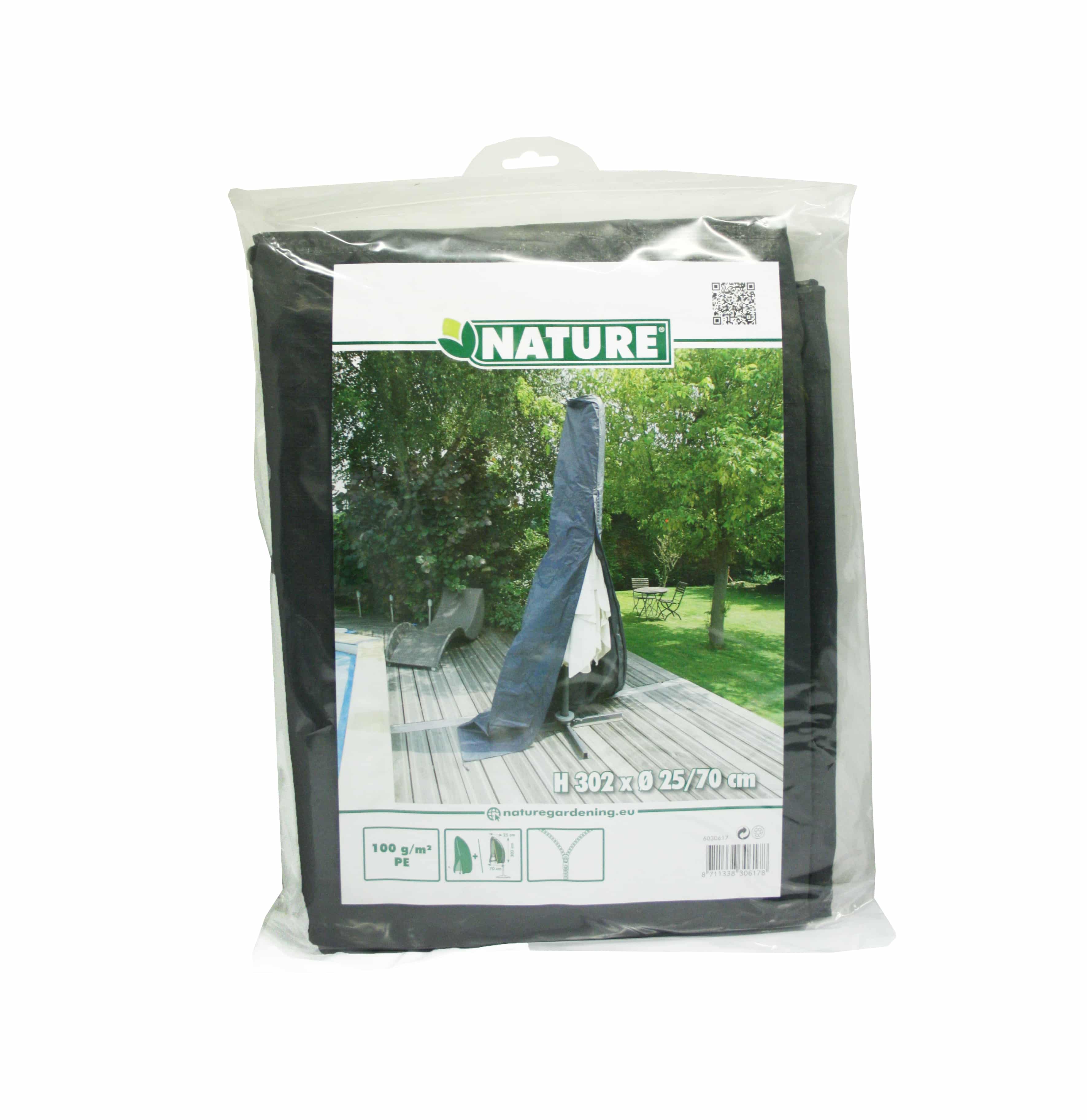 Tuinmeubelhoes van Nature voor het beschermen van uw parasol tegen diverse weersomstandigheden en stof. Deze grijskleurige hoes is gemaakt van polyethyleen, is uv-bestendig en heeft een dichtheid van 100 g/m². Inclusief ogen en nylonkoord onder aan de hoes en een ritssluiting. De hoes wordt geleverd met een stok zodat u zonder trap de hoes over de parasol kunt hangen. Geschikt voor een hangparasol. Afmeting: H 302 cm, diameter 25/70 cm.