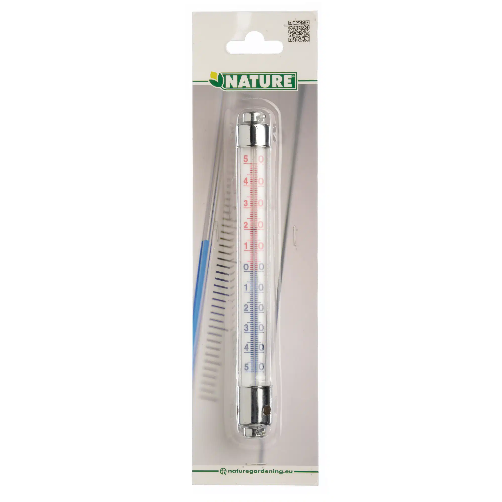 “Metalen kozijnthermometer van Nature voor buitengebruik. U kunt deze thermometer buiten op het raamkozijn monteren en vanuit binnen aflezen. Afmeting: 20 x 2,5 x 2,5 cm.