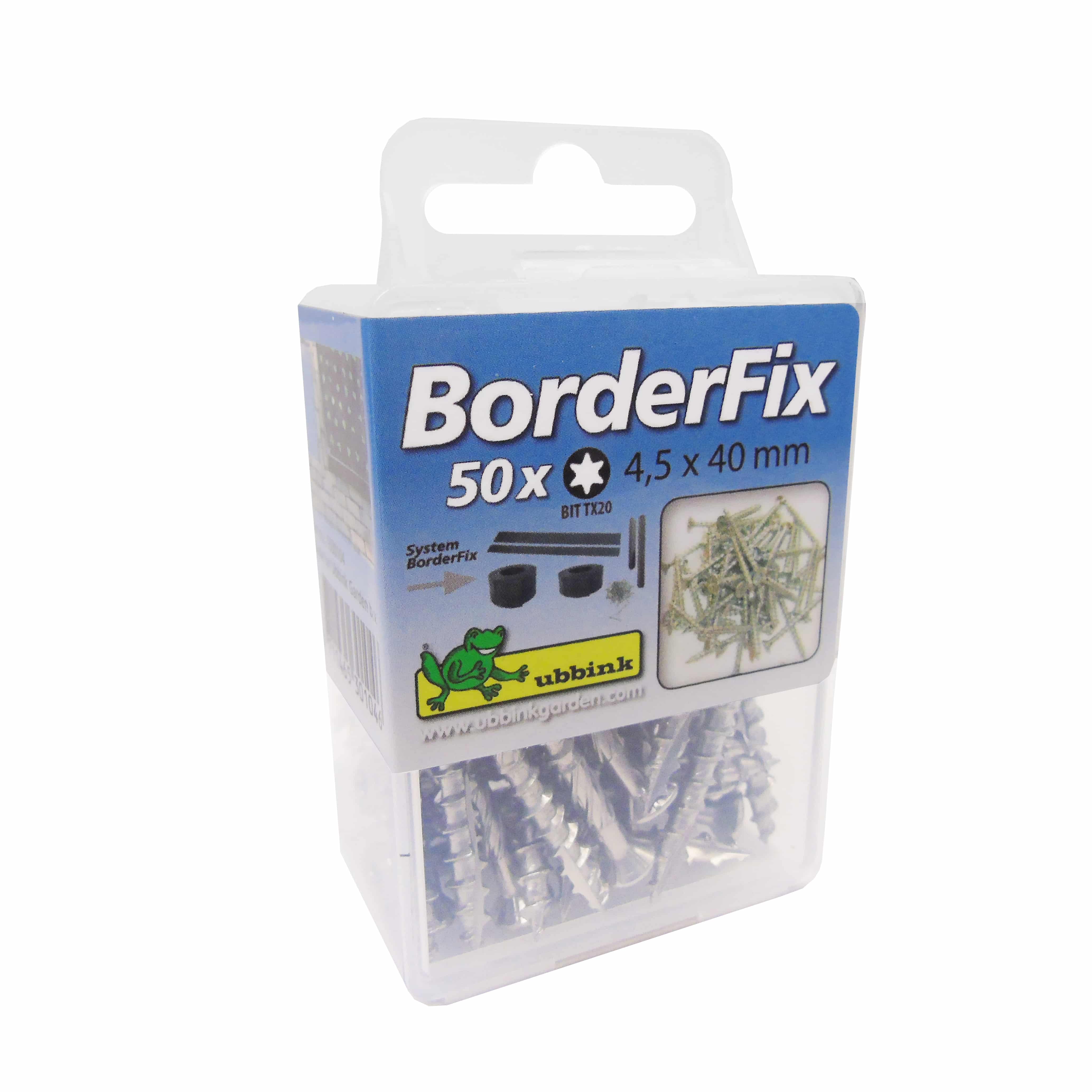 Doosje met 50 zelfborende Torx-schroeven van roestvrij staal van Nature om de borderranden te bevestigen op piketpalen met een hoogte van 38 of 58 cm.