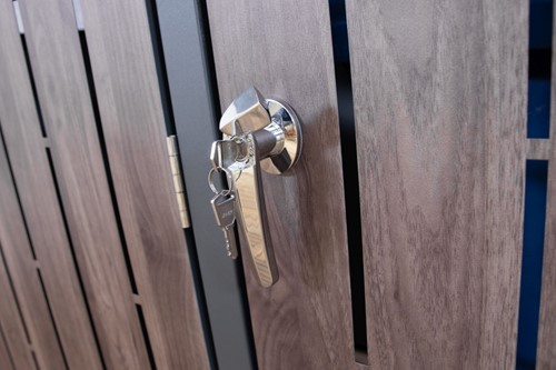 Containerberging gemaakt van 0,8 mm gegalvaniseerd staal en deuren met een walnootkleurige houtlook. De berging kan worden afgesloten met de twee bijgeleverde sleutels.