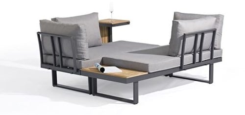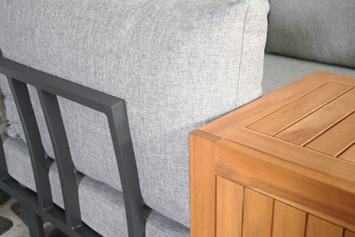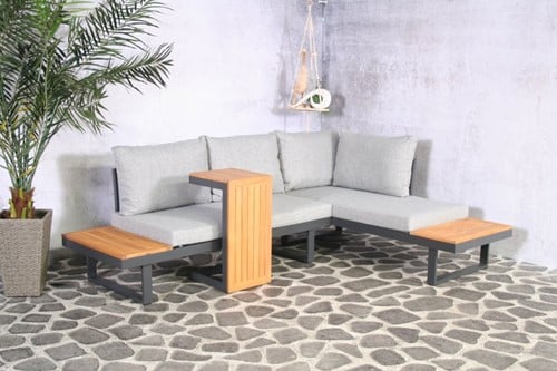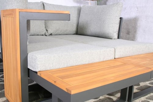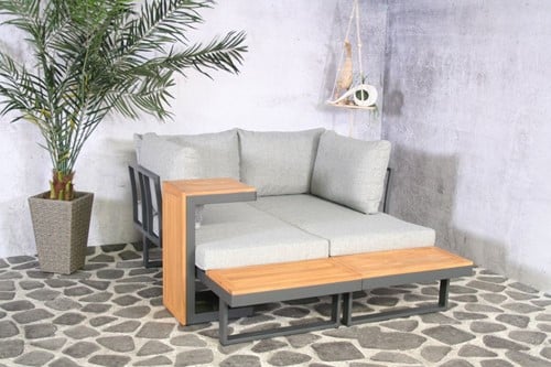 Dit is een hele moderne multifunctionele loungeset. Deze loungeset is in diverse opstellingen in te delen. De kussens zijn gemaakt van polyester en zijn waterafstotend. Het frame is van aluminium met accacia hout. Accacia hout wordt door de jaren heen mooi grijs. Wilt u liever de originele kleur behouden dan adviseren wij de set jaarlijks te behandelen met olie, beits of verf.
