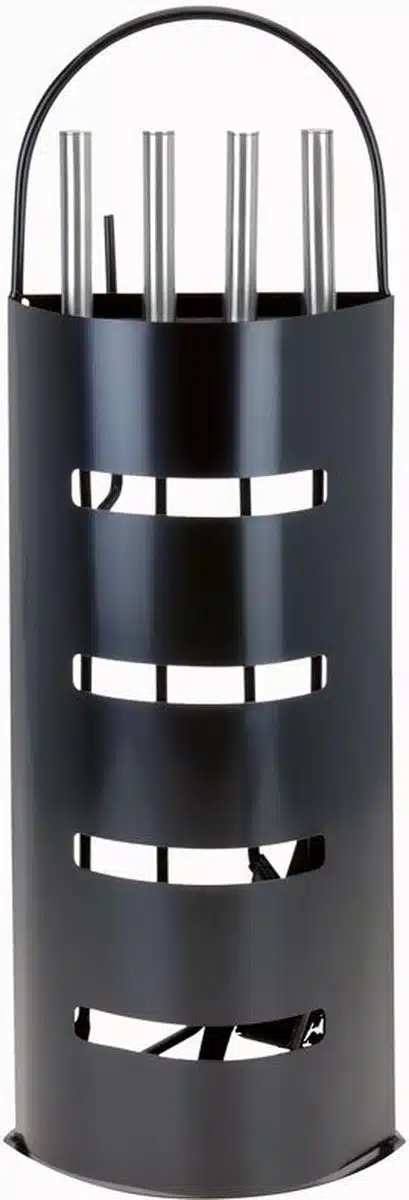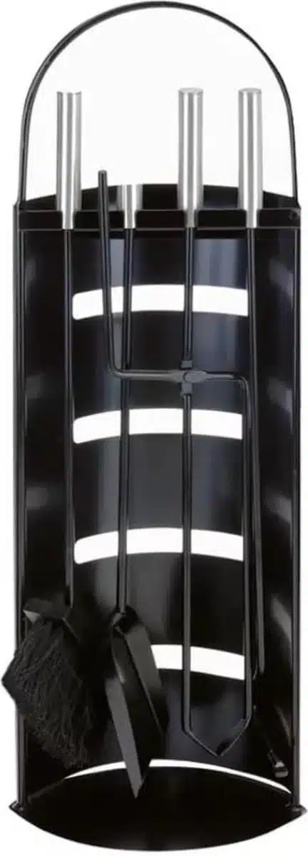 Deze design openhaardset bestaat uit een borstel, tang, pook, schep en een basisstandaard. Deze mooie set is van RVS en verkrijgbaar in het zwart.