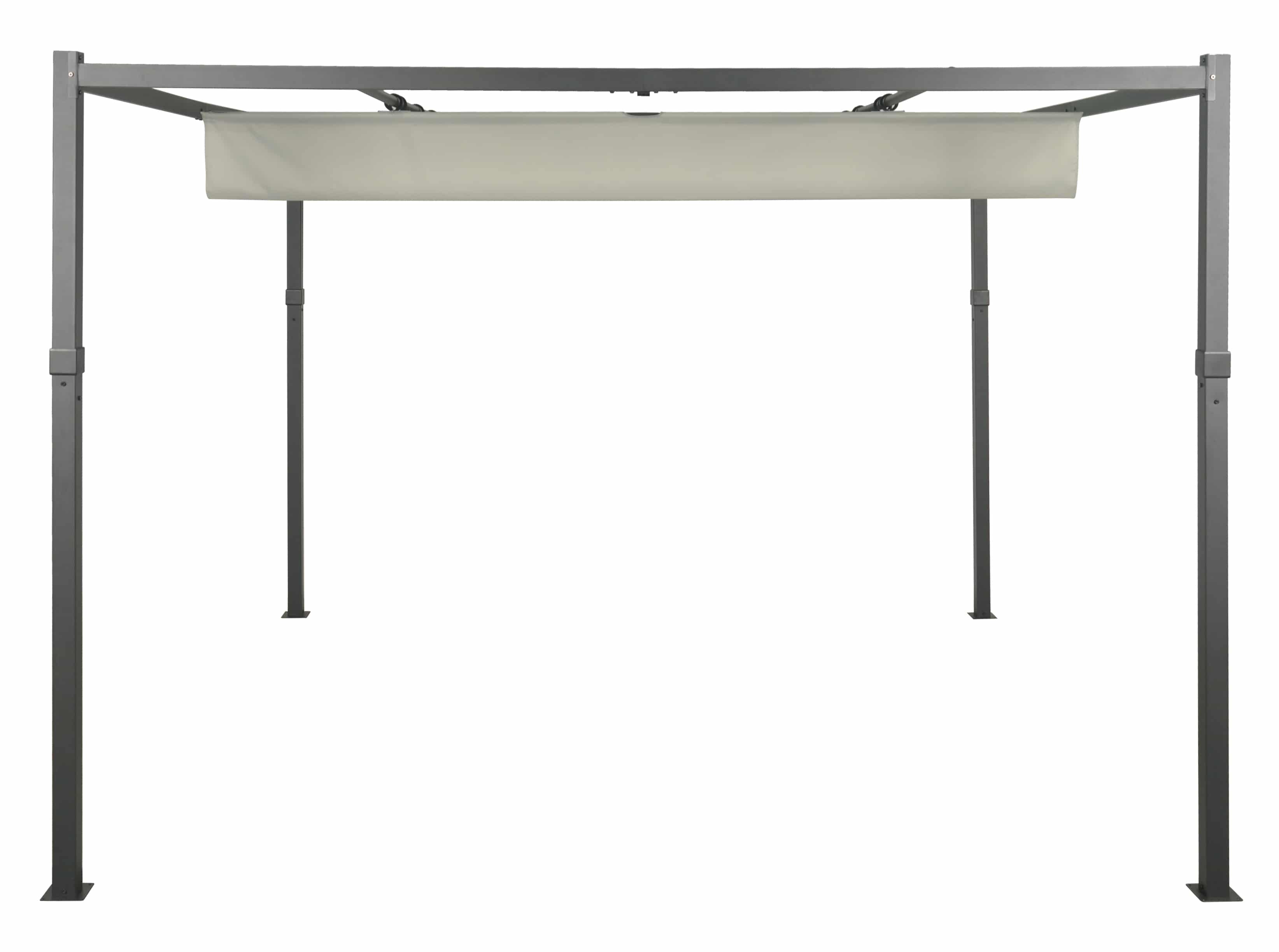De afmetingen zijn 295x295x220 cm. De verticale palen zijn 6x60mm en de horizontale palen zijn 60x20mm. Het dak is schuifbaar en gemaakt van polyester met UV50+.