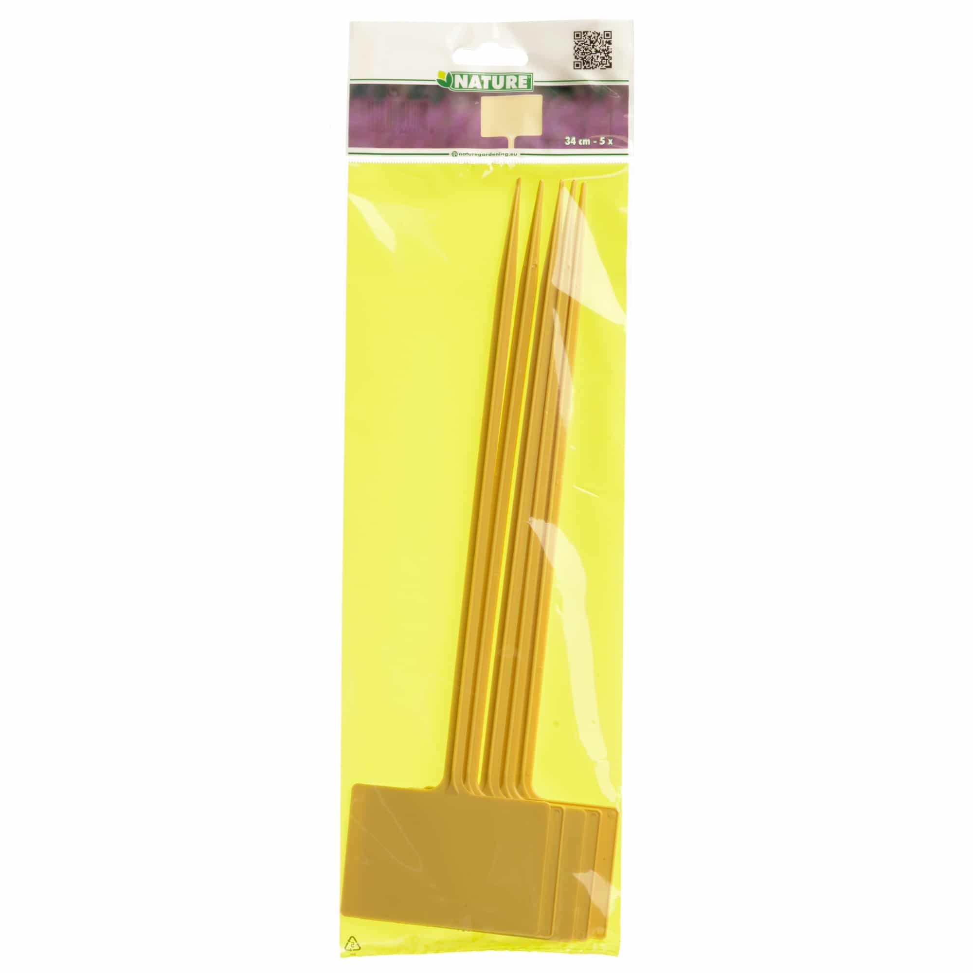 Label van gele harde kunststof van Nature voor het duidelijk bemoemen van planten en bloemen in de tuin. Het grote schrijfplaatje heeft een afmeting van 5,5 x 8,5 cm. Verpakt per 5 stuks.