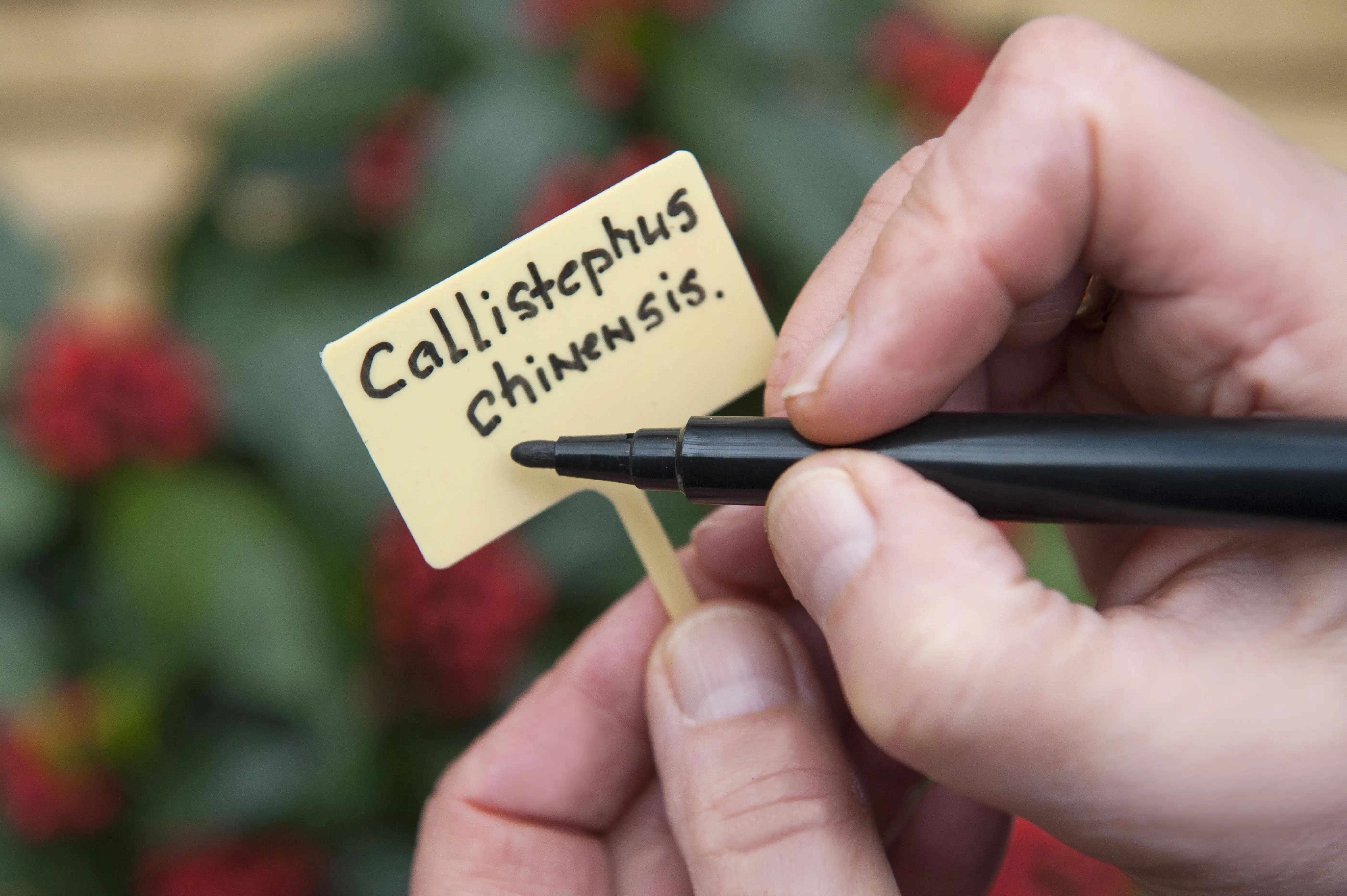 Plaatetiket van Nature, van gele harde kunststof, geleverd met permanente markeerstift. Het grote, duidelijke schrijfplaatje heeft een afmeting van 3 x 5 cm. H 13 cm, verpakt per 10 stuks.