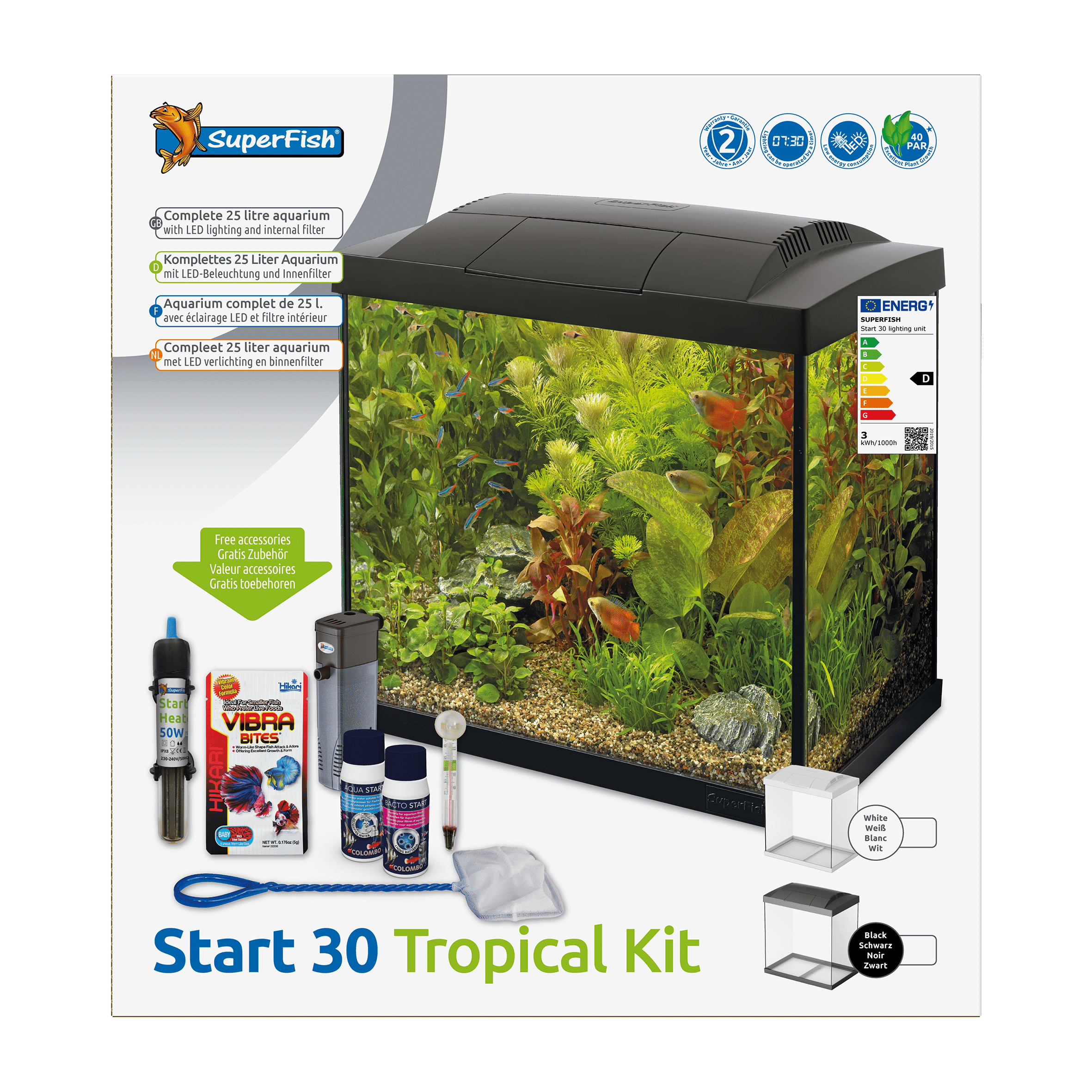 SuperFish Start zijn voordelige complete starterkits met energiezuinige LED-verlichting, binnenfilter en handige accessoires om de aquarium¬hobby te starten. Het aquariumdeksel heeft een klepje om het voeren van de vissen gemakkelijk te maken. De Start Kits worden geleverd met handige accessoires om uw aquariumhobby te beginnen. De Start aquaria zijn voorzien van energiezuinige en veilige LED verlichting. Het helder witte licht is perfect voor plantengroei.